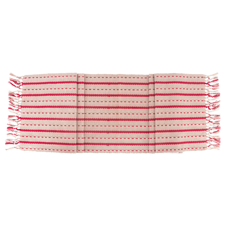 Bring a crisp pop of pattern to the table with this red-and-cream cotton table runner, where clean stripes meet charming saddle-stitch detailing. Finished with fringed ends and a comfortable weight, it layers effortlessly for everyday dining and casual entertaining. Approximate dimensions are 72 x 13 x inches.