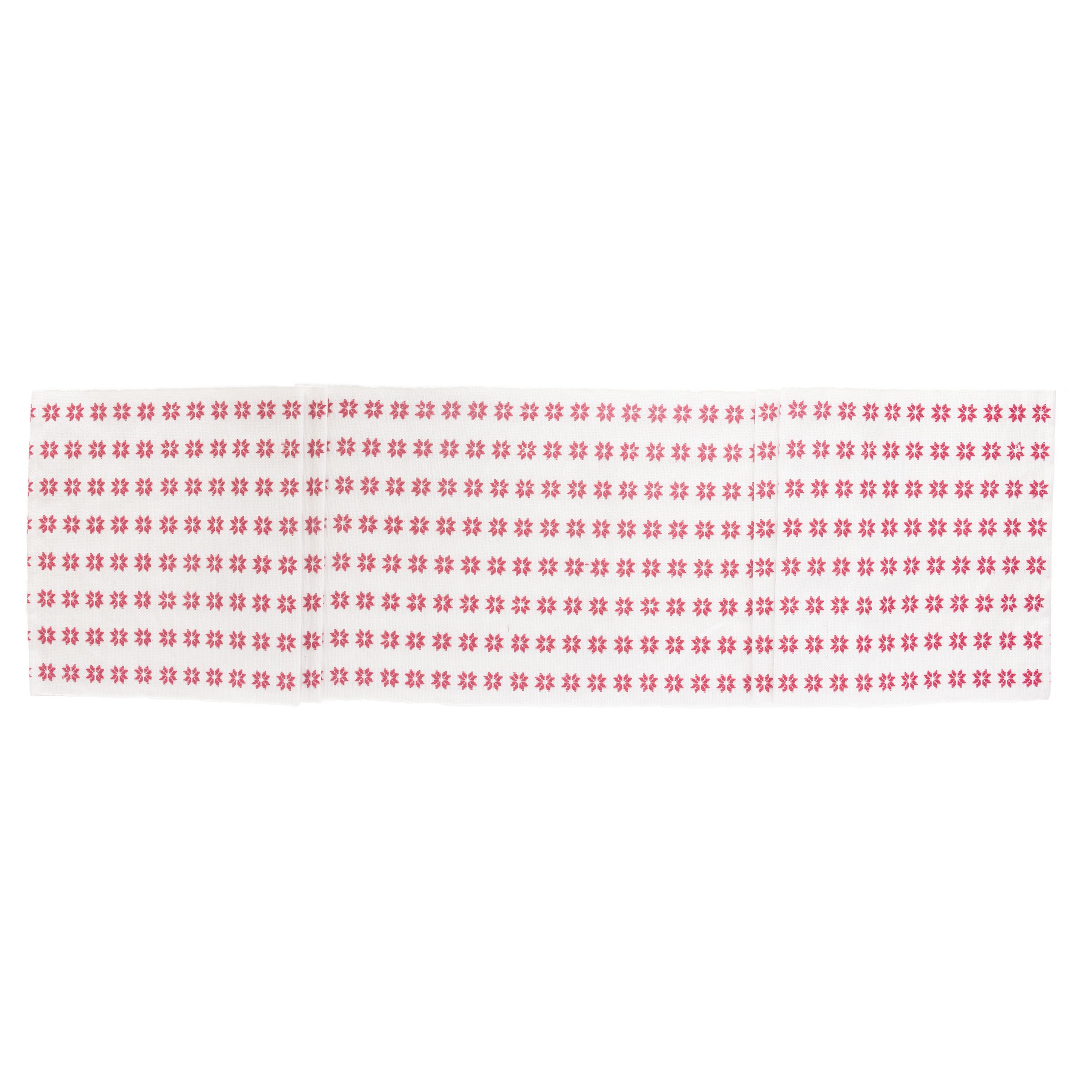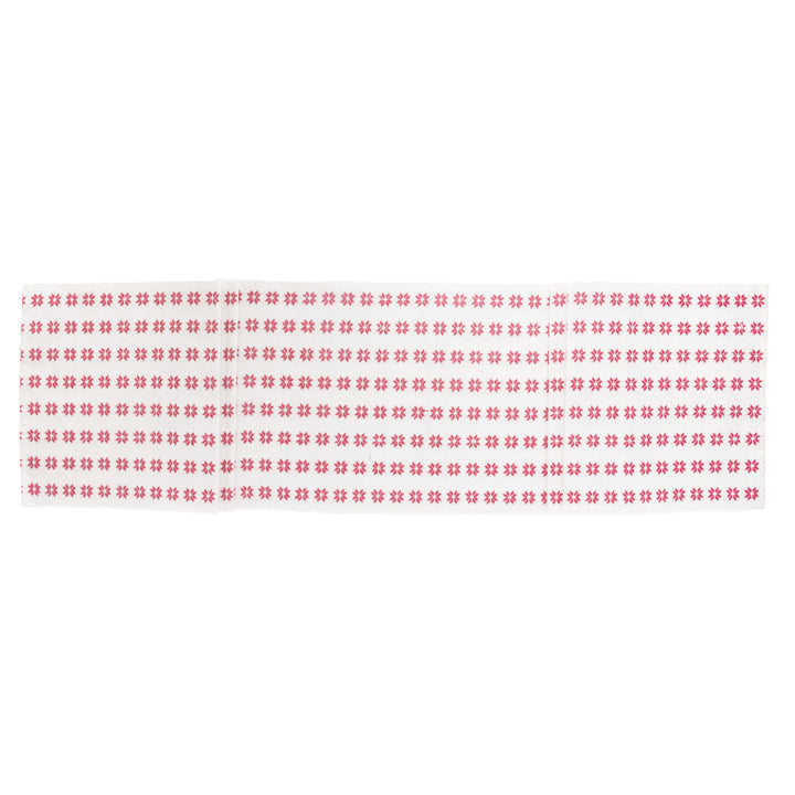 Printed with tidy rows of red snowflakes on white, this cotton table runner adds crisp pattern and a pop of color to your table. Soft, washable, and made for daily dining or special gatherings, it layers beautifully with solids or gingham for a fresh, modern look. Approximate dimensions are 72 x 13 x inches.