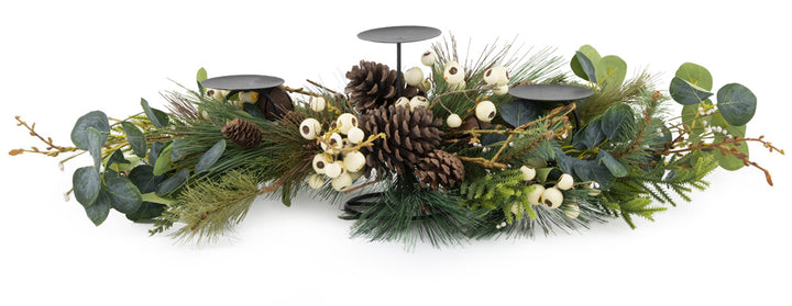 Layered with lifelike greenery, creamy white berries, and natural pinecones, the White Berry Bell Centerpiece brings organic texture and easy elegance to a table, console, or mantel. An iron frame with integrated candle plates (candles not included) secures the artful mix of iron, plastic, pinecone, foam, fabric, and iron wire for a lasting accent. Approximate dimensions are 33 x 14 x 9 inches.