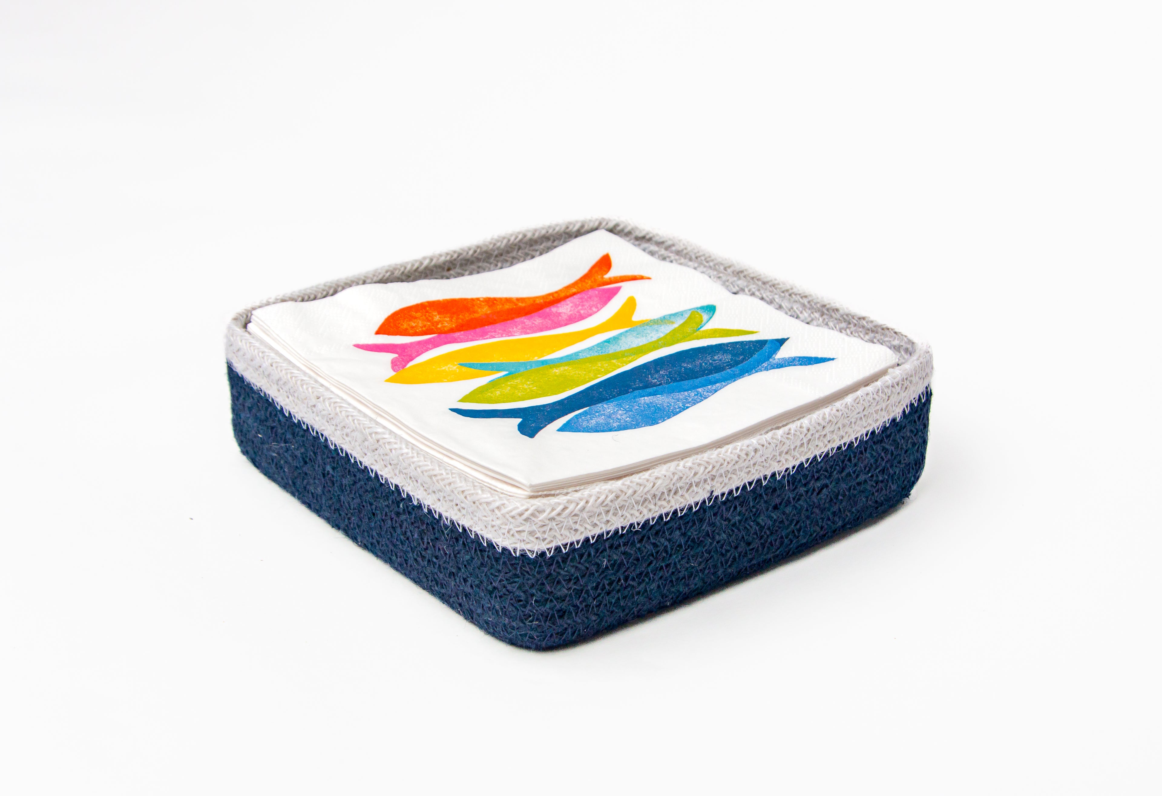 Woven from durable jute in deep navy with soft gray trim, this lunch caddy brings relaxed texture and tidy structure to everyday spreads. Its square profile neatly corrals napkins, cutlery, and condiments, letting your favorite patterns shine while keeping everything within easy reach. Approximate dimensions are 8 x 8 x 2.5 inches.