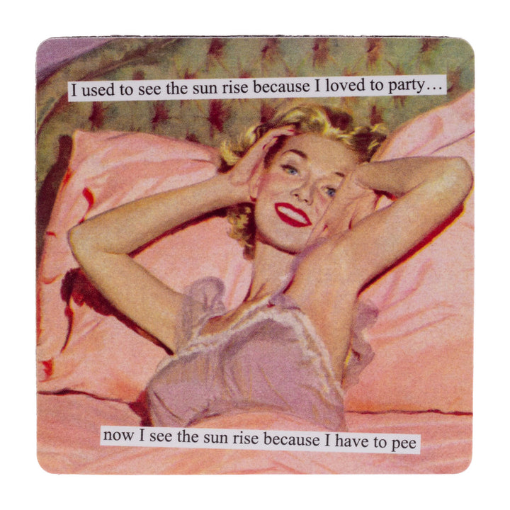 Bring snarky charm to your kitchen with Anne Taintor’s Sun Rise magnet, where a glamorous retro vignette delivers the wickedly relatable line: “I used to see the sun rise because I loved to party… now I see the sun rise because I have to pee.” Crafted from laminated paper with a magnetic backing, it’s a cheeky pick‑me‑up for the fridge, file cabinet, or any metal surface. Approximate dimensions are 3.375 x 3.375 x .25 inches.