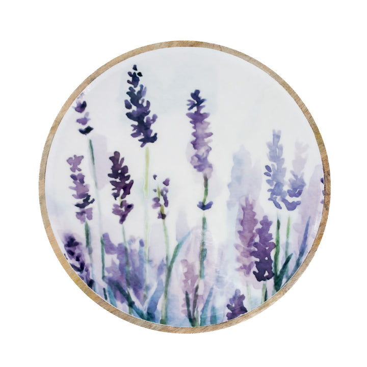 Watercolor-inspired lavender blooms drift across a glossy white surface, beautifully framed by the warm grain of natural mango wood. Perfect for cheeses, fruit, or small bites, this round platter serves with easy elegance and doubles as a serene decorative accent when not in use. Approximate dimensions are 12 x x .5 inches.