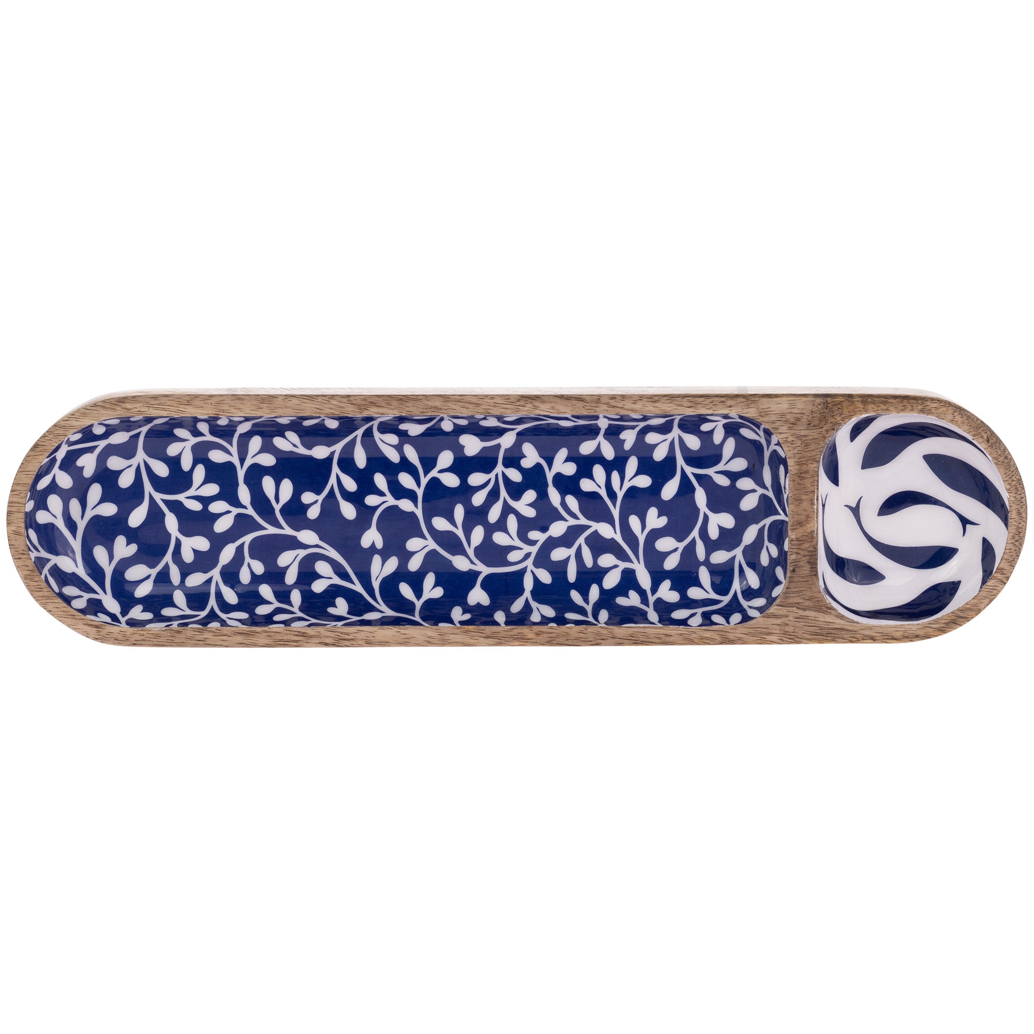 Crafted of mango wood, this sectioned tray brings breezy coastal style to the tabletop, its long well patterned with white seaweed tendrils as an artful backdrop for charcuterie and small bites. A petite round compartment features a playful fish motif to keep dips, nuts, or garnishes neatly separate while elevating everyday entertaining. Approximate dimensions are 16 x 4 x 1.5 inches.