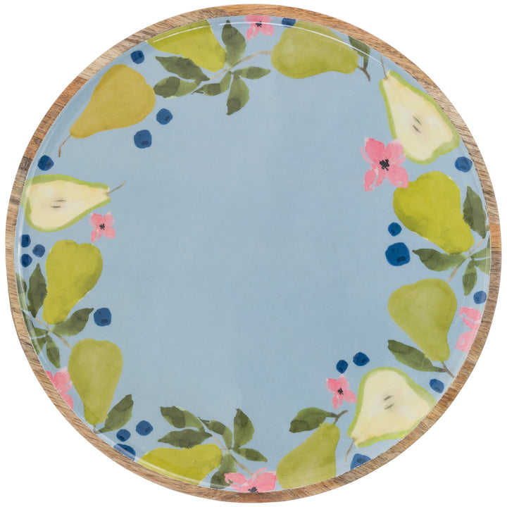 Painterly Anjou pears and soft florals circle a sky-blue center, while the natural mango wood lends organic warmth to this round platter. A charming stage for cheeses, fruit, and sweets, it brings easy, everyday freshness to the table. Approximate dimensions are 12 x x .75 inches.