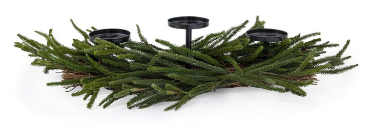 Lifelike evergreen sprigs arranged on a vine base cradle three sleek metal candle plates, creating a clean, low-profile centerpiece with sculptural depth. Crafted from foam, polyester, and fabric botanicals for long-lasting freshness, this greenery accent brings a subtly festive focal point to dining tables, consoles, or mantels without any upkeep. Approximate dimensions are 27 x 11 x 6 inches.