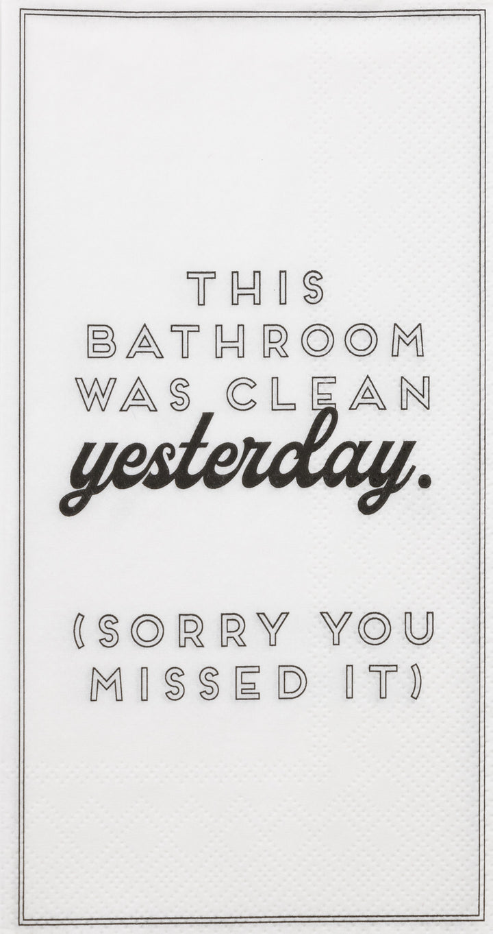 Add a wink to the powder room with these paper guest towels, featuring the cheeky line “This bathroom was clean yesterday (sorry you missed it).” Soft, absorbent, and perfectly sized for single-use hygiene, they keep your vanity tidy while giving guests a smile. Approximate dimensions are 8.5 x 4.5 x 1 inches. German printed on soft, 3-ply paper.