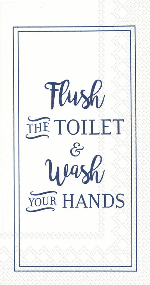 Set a courteous tone in the powder room with these soft, absorbent paper guest towels featuring a crisp navy reminder to “Flush the Toilet & Wash Your Hands.” The clean white design with a subtle embossed border offers disposable convenience and a polished finish for everyday baths and entertaining. Approximate dimensions are 4.25 x 1 x 8.25 inches. German printed on soft, 3-ply paper.