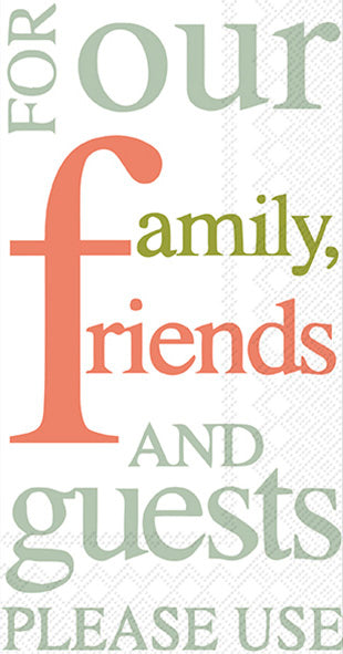 Welcome guests with these sentiment-forward paper guest towels, featuring a friendly “for our family, friends and guests—please use” message in peach and sage typography. Soft yet sturdy and highly absorbent, they bring polished, hygienic convenience to powder rooms, vanity trays, and buffet stations every day. Approximate dimensions are 8.25 x 4.5 x 1 inches. German printed on soft, 3-ply paper.