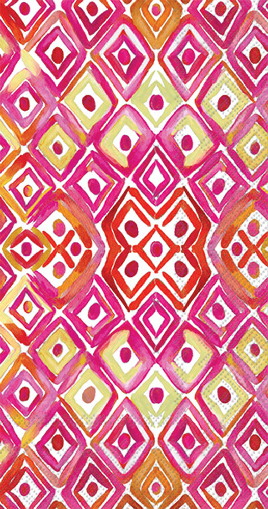 Awash in painterly diamond motifs of pink, coral, and citrus, the Pink Paradise Guest Towel brings breezy coastal energy to the powder room or party. Printed on quality paper, these disposable guest towels keep gatherings polished and effortless with a vibrant pop of pattern. Approximate dimensions are 8.25 x 4.5 x 1 inches. German printed on soft, 3-ply paper.