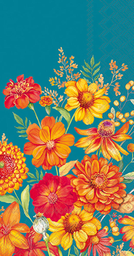 Arya Guest Towel Petrol sets vivid warm-hued florals against a deep petrol backdrop for a striking pop of color at the sink or buffet. Printed on quality paper, these single-use guest towels deliver a crisp, hygienic finish to everyday hosting and special gatherings. Approximate dimensions are 8.25 x 4.5 x 1 inches. German printed on soft, 3-ply paper.