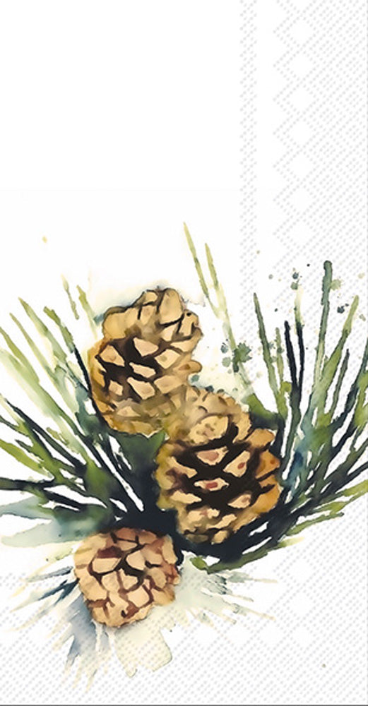 Bring woodland elegance to the powder room with our White Spruce Guest Towel, featuring painterly pinecones and lush greenery on crisp, premium paper. Soft, absorbent, and disposable, these upscale napkins effortlessly polish sink-side moments and cocktail service alike. German printed on soft, 3-ply paper.