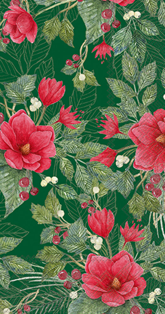 Invite a festive flourish to the powder room or buffet with Christmas Flowers Guest Towel Green, a richly hued paper design blooming with crimson camellias, glossy berries, and painterly foliage. Made of single-use paper for easy hosting, these guest towels deliver crisp color and convenient elegance for gatherings large or small. Approximate dimensions are 8.25 x 4.5 x 1 inches. German printed on soft, 3-ply paper.