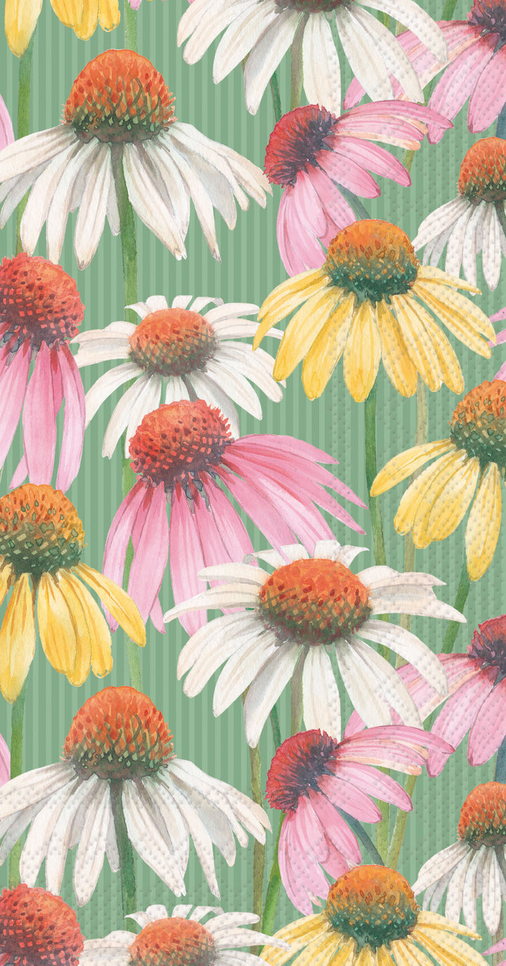 Bring a touch of wildflower charm to the powder room or buffet with our Pastel Garden Green Guest Towel, layered in painterly echinacea and coneflowers over a fresh striped backdrop. Printed on soft, premium paper, these disposable guest towels offer an inviting pop of color and effortless convenience for everyday hosting. Approximate dimensions are 8.25 x 4.5 x 1 inches. German printed on soft, 3-ply paper.