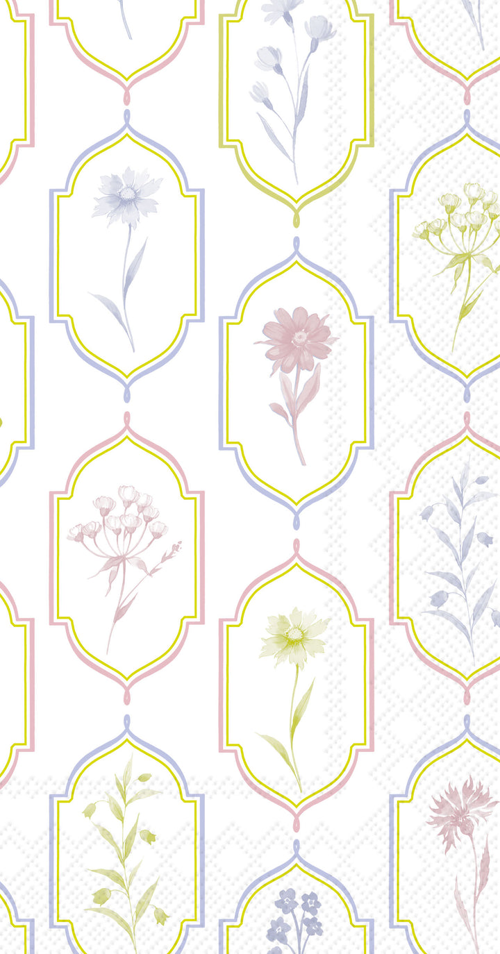 Philipa Light Green guest towels showcase delicate botanical cameos in light green, blush, and periwinkle, each framed by graceful ogee outlines for a quietly chic pattern. Printed on soft, absorbent paper, they bring instant polish to powder rooms, vanities, and buffet stations. Approximate dimensions are 8.25 x 4.5 x 1 inches. German printed on soft, 3-ply paper.