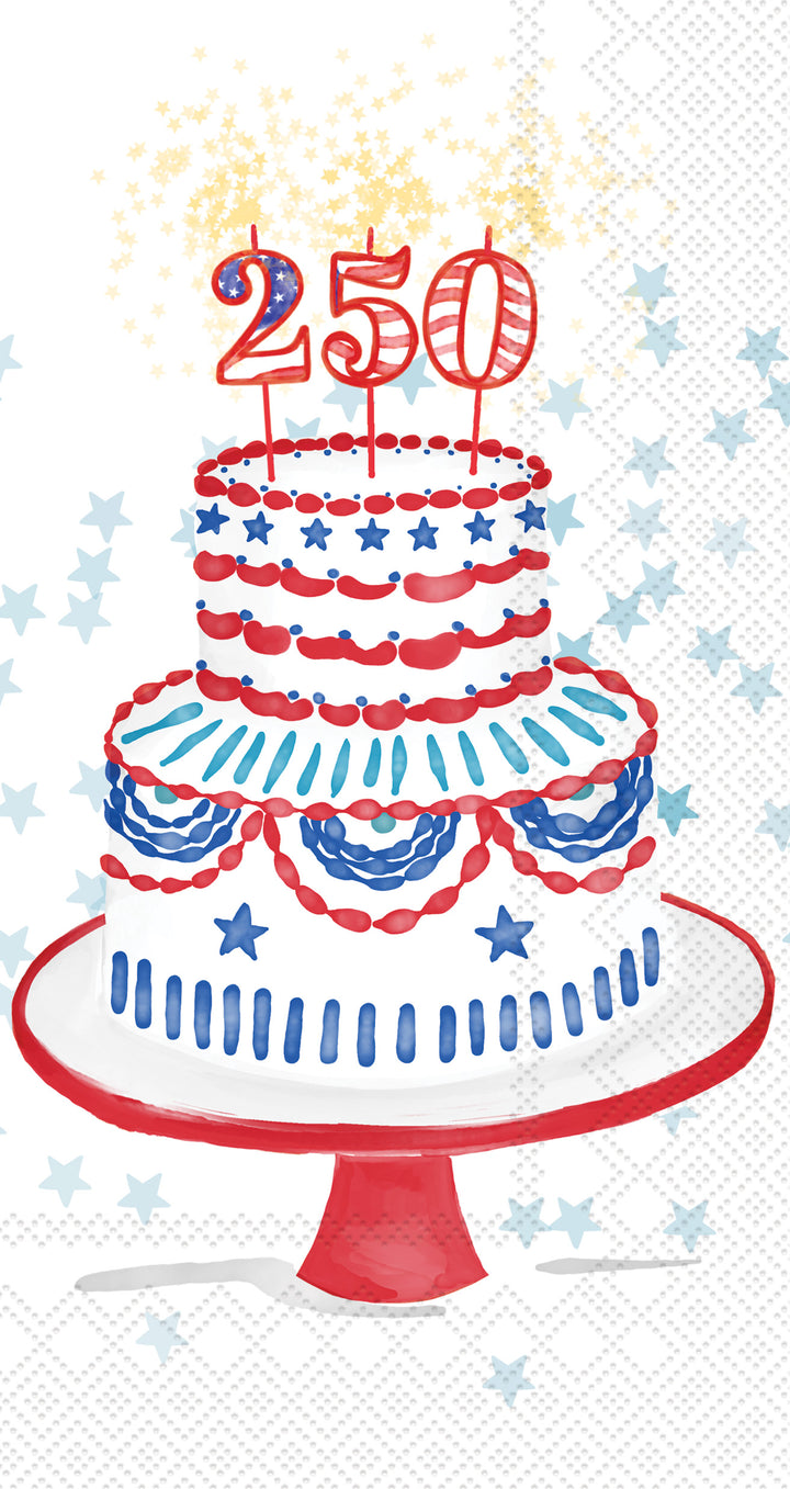 Mark America’s 250th with these paper guest towels featuring a festive tiered cake iced in red, white, and blue and topped with starry “250” candles. Soft, absorbent, and ideal for powder rooms or dessert stations, they deliver patriotic style while keeping hands and bites tidy. German printed on soft, 3-ply paper. Approximate dimensions are 7.9 x 4.3 x 1 inches.