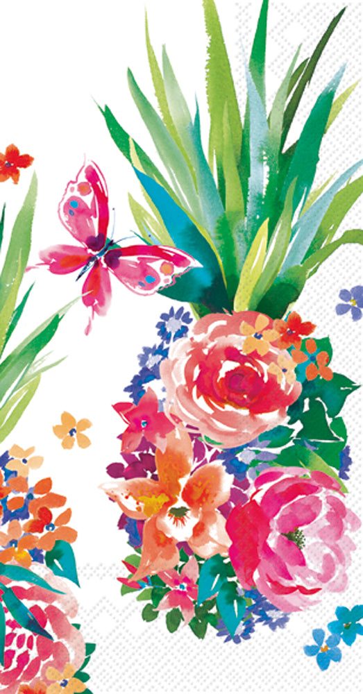 The Caribbean Bar Guest Towel sets a coastal mood with vibrant watercolor pineapples, lush florals, and a playful butterfly on a crisp white backdrop. Crafted from soft, sturdy paper, these single‑use guest towels bring a fresh pop of color to bars and powder rooms while keeping cleanup effortless. Approximate dimensions are 4.5 x 1 x 8.25 inches. German printed on soft, 3-ply paper.