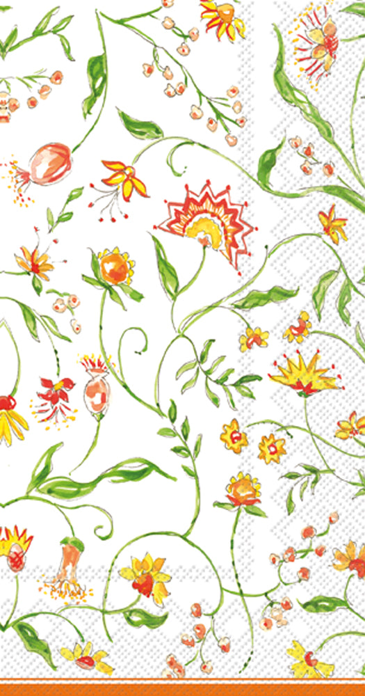 Watercolor blossoms in cheerful oranges and yellows trail across the Ella Guest Towel, bringing a fresh floral accent to sink-side settings and buffet trays. Made of soft, absorbent paper with a crisp orange border, these disposable guest towels elevate everyday hosting with color and convenience. Approximate dimensions are 4.5 x 1 x 8.25 inches. German printed on soft, 3-ply paper.