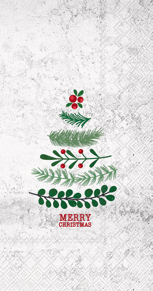 Layered sprigs and berries shape a modern, natural tree with a crisp “Merry Christmas” greeting on these soft, absorbent paper guest towels. Ideal for powder rooms and buffet stations, they deliver single-use convenience and a refined, botanical holiday touch. Approximate dimensions are 4.5 x 1 x 8.25 inches. German printed on soft, 3-ply paper.