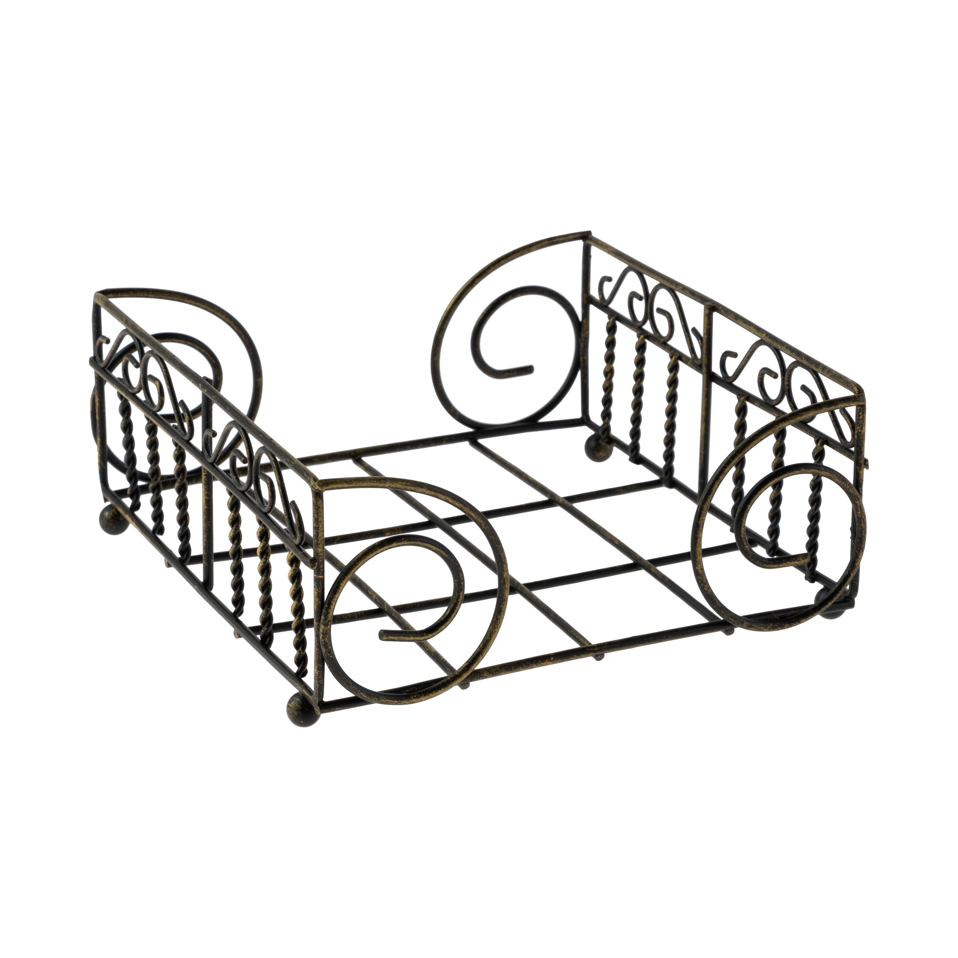 Evoking wrought-iron garden gates, this metal cocktail caddy showcases graceful scrollwork and textured twists in an antique brass finish. The open-grid base neatly corrals napkins, coasters, or small bar tools while adding timeless pattern and polish to any serving setup. Approximate dimensions are 5.75 x 5.75 x 2.75 inches.