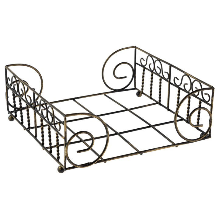 Evoking the romance of wrought-iron garden gates, this metal lunch caddy pairs an antique brass finish with scroll and twist patterns for a timeless accent at the table or buffet. The open grid base and raised sides neatly corral napkins, plates, or utensils while keeping contents easy to see and reach. Approximate dimensions are 7 x 7 x 2.75 inches.