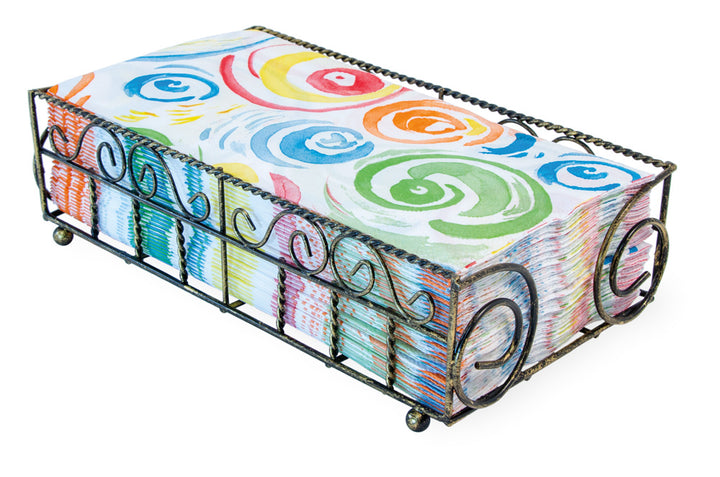 Evoking the graceful scrollwork of a vintage garden gate, this metal guest caddy in an antique brass finish brings charming pattern and polish to the bath or buffet. Sturdy yet refined, it neatly corrals a stack of standard guest towels or napkins and keeps them within easy reach for effortless hosting. Approximate dimensions are 9 x 5.25 x 2.5 inches.