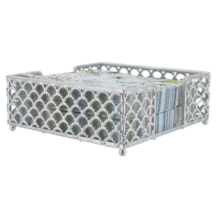 With a scalloped lattice pattern and luminous silver finish, this metal lunch caddy brings easy elegance to the table. Sized to corral luncheon napkins or small essentials, its sturdy build and ball feet keep items neatly in place from kitchen counter to buffet. Approximate dimensions are 7 x 7 x 2.75 inches.