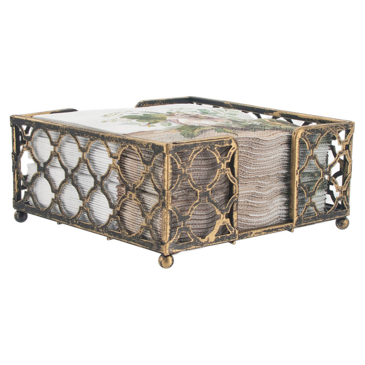 The Trellis Cocktail Caddy in antique brass brings old‑world charm to any bar, with trellis-patterned metal latticework that frames and organizes cocktail napkins beautifully. Resting on small ball feet, it keeps essentials within reach while elevating and protecting surfaces. Approximate dimensions are 5.25 x 5.25 x 2.75 inches.