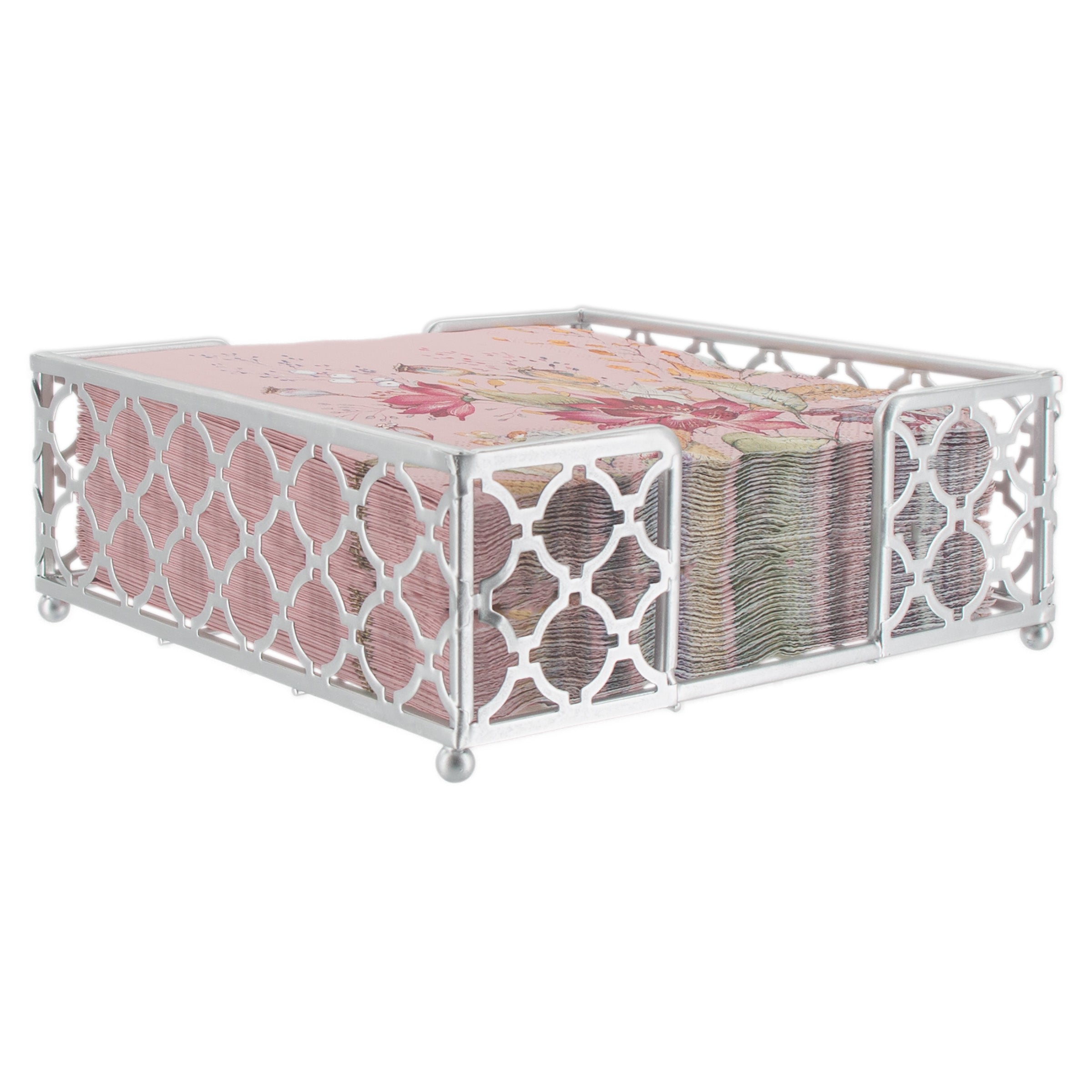 A shimmering silver trellis wraps this metal lunch caddy, bringing crisp pattern and airy elegance to the table. Crafted with sturdy lattice sides and rounded feet, it neatly presents and dispenses standard luncheon napkins for everyday meals and effortless entertaining. Approximate dimensions are 7 x 7 x 2.75 inches.