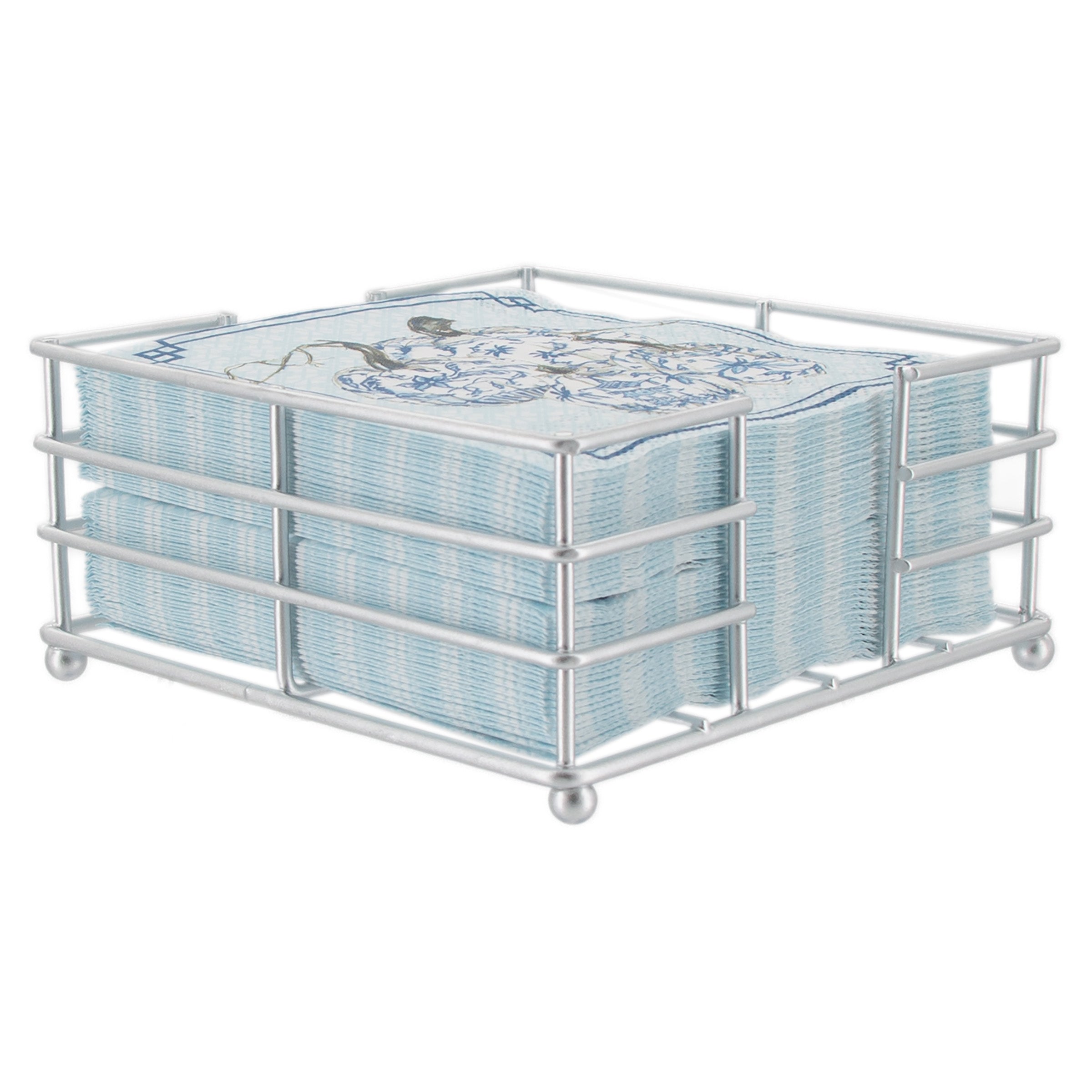 Streamlined in a silver metal grid, the Metro Cocktail Caddy corrals cocktail napkins with modern polish while letting your favorite patterns shine. Elevated ball feet keep stacks neat and dry on the bar or coffee table, fitting standard square napkins for effortless entertaining. Approximate dimensions are 5.25 x 5.25 x 2.75 inches.