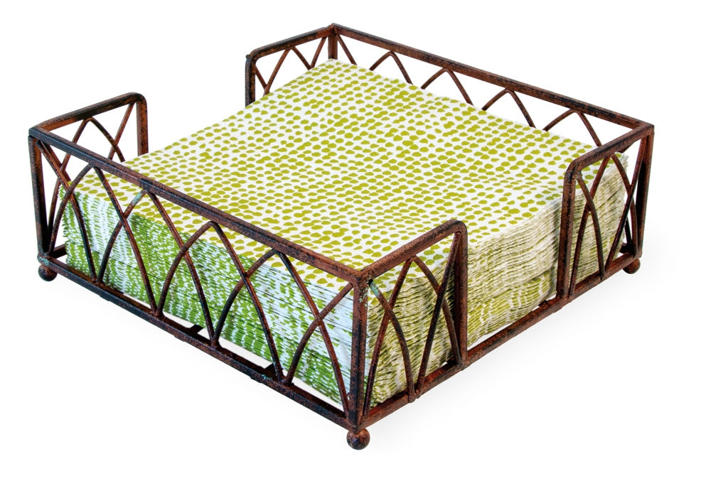 The Arch Cocktail Caddy in Aged Chestnut pairs airy, arched latticework with a timeworn metal finish for effortless bar style. Built to fit standard cocktail napkins and showcase their patterns, it corrals stacks neatly so every pour feels polished. Approximate dimensions are 5.5 x 5.5 x 2.5 inches.