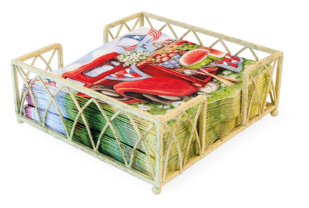 With a graceful arch pattern and soft antique white finish, this metal lunch caddy brings heirloom character to the table while corralling a stack of standard luncheon napkins. Sturdy and easy to tote, its footed open-frame design keeps napkins accessible on countertops, buffets, or outdoor tables. Approximate dimensions are 6.75 x 6.75 x 2.5 inches.