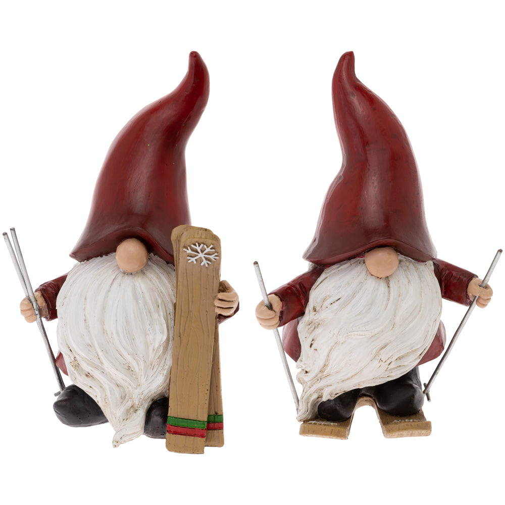 These Skiing Santa Gnomes (set of two) bring a playful slope-side vibe, with resin figures featuring tall red hats, flowing beards, and ready-to-ride skis and poles. Crafted for everyday display, their sturdy build and charming details make easy accents for mantels, shelves, and tabletops. Approximate dimensions are 5.5 x 3.75 x 8.5 inches.