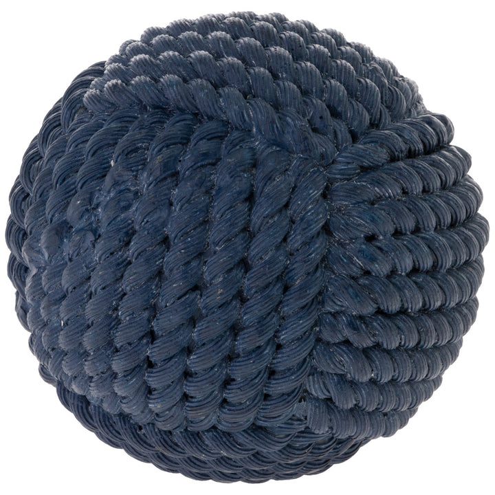 Cast in durable resin with the texture of hand-twisted rope, this 4-inch dark blue ball brings a crisp coastal note to bowls, trays, or bookshelf displays. Style it solo for a sculptural accent or group with mixed finishes to anchor nautical vignettes. Approximate dimensions are 4 x 4 x 4 inches.