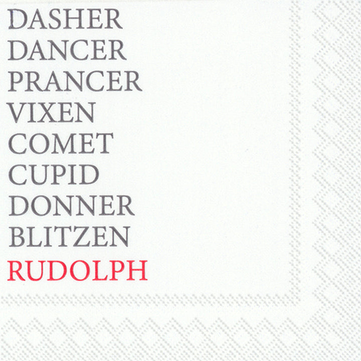 Crisp white paper cocktail napkins showcase the reindeer roll call—Dasher to Rudolph—in clean, modern typography that invites conversation. Absorbent and party-ready, they add a wink of holiday humor while keeping cocktails neat from first toast to last nibble. Approximate dimensions are 5 x 1 x 5 inches. German printed on soft, 3-ply paper.
