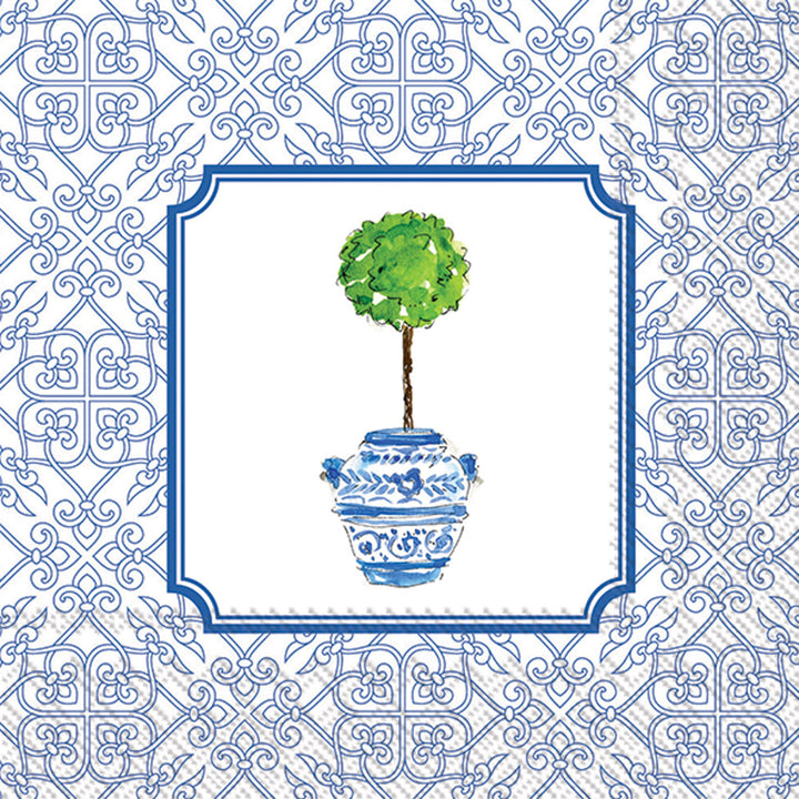 Grace your bar cart with these paper cocktail napkins, featuring a watercolor-style topiary in a blue patterned pot framed by an elegant blue lattice. Printed on quality paper, the Blue Topiary Cocktail Napkin brings polished pattern and easy elegance to every pour and petite bite. Approximate dimensions are 5 x 5 x 1 inches. German printed on soft, 3-ply paper.