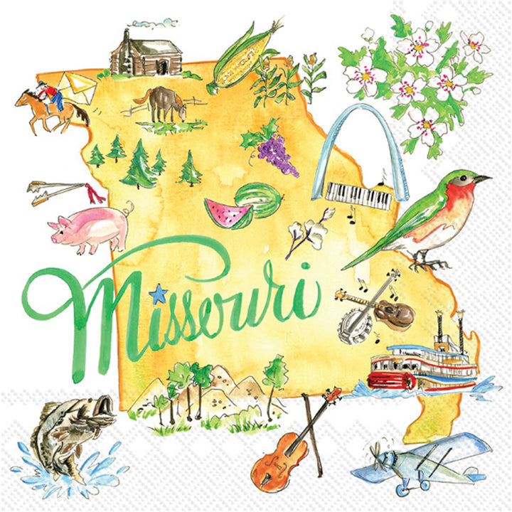 Celebrate the Show-Me State with these paper cocktail napkins, illustrated in vibrant watercolor with a map of Missouri and its beloved icons including the Gateway Arch and riverboats. Perfect for cocktails and small bites, they bring easy state pride to happy hours, tailgates, and everyday entertaining. Approximate dimensions are 5 x 1 x 5 inches. German printed on soft, 3-ply paper.