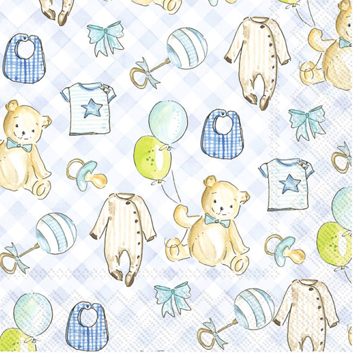 Adorned with soft watercolor teddy bears, bibs, pacifiers, onesies, and floating balloons over pale blue gingham, the Boy Baby Cocktail Napkin brings playful charm to every sip. Made of quality paper for reliable absorption, it’s an easy, adorable finishing touch for baby showers, gender reveals, and welcome-home gatherings. Approximate dimensions are 5 x 5 x 1 inches. German printed on soft, 3-ply paper.