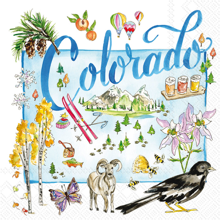 Celebrate Centennial State spirit with our Colorado State Collection Cocktail Napkin, awash in watercolor icons—from soaring peaks and aspen groves to skis, hot-air balloons, and the delicate columbine. Printed on quality paper, it brings effortless state-pride style to cocktails, charcuterie, and casual gatherings. Approximate dimensions are 5 x 1 x 5 inches. German printed on soft, 3-ply paper.
