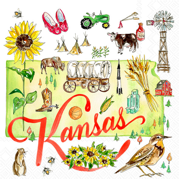 Raise a glass to the Sunflower State with our Kansas State Collection Cocktail Napkin, showcasing charming watercolor icons like bison, wheat, windmills, tractors, and ruby shoes around a bold “Kansas.” Crafted from quality paper, these state-proud cocktail napkins bring cheerful color and conversation-starting style to happy hours, game-day spreads, and hometown gatherings. Approximate dimensions are 5 x 1 x 5 inches. German printed on soft, 3-ply paper.