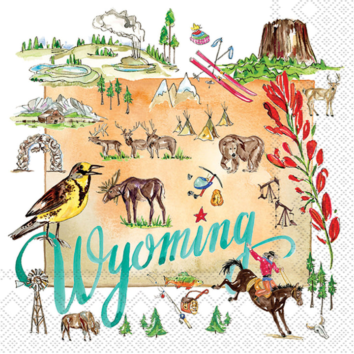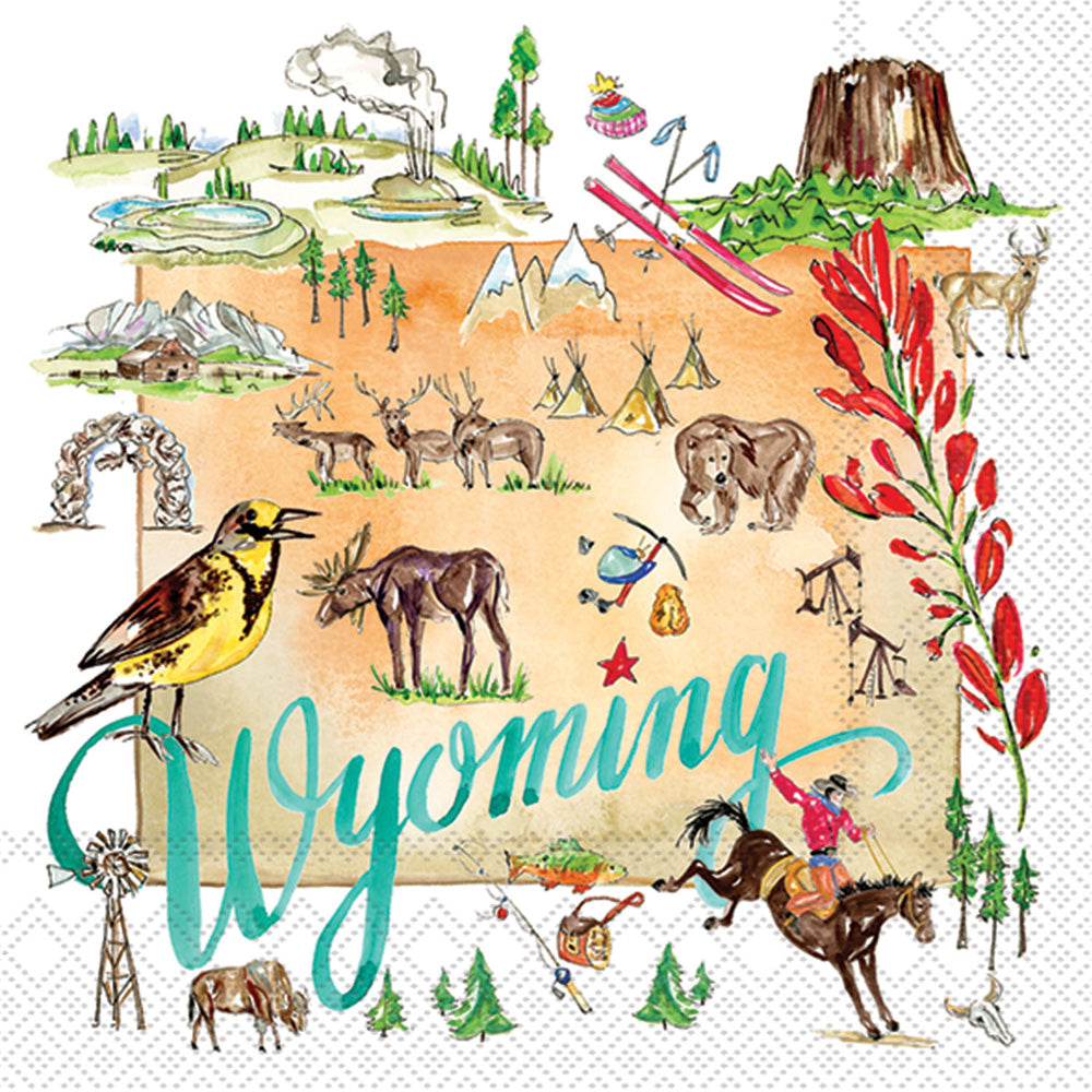 Celebrate the spirit of the Equality State with our Wyoming State Collection cocktail napkins, featuring painterly illustrations of geysers, Devil’s Tower, elk and moose, prairie blooms, and a rodeo rider in vivid color. Printed on soft, absorbent paper, they elevate happy hours and casual gatherings with a distinctive sense of place. Approximate dimensions are 5 x 5 x 1 inches. German printed on soft, 3-ply paper.