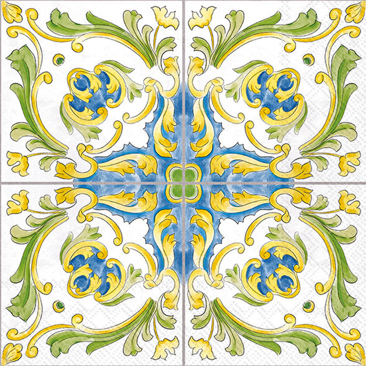 Inspired by classic ceramic tiles, this paper cocktail napkin features hand-painted scrollwork in sapphire blue, fresh green, and sunlit yellow that instantly brightens the bar. Soft yet sturdy, it adds pattern-rich polish to cocktails and small bites, making everyday entertaining feel effortlessly curated. Approximate dimensions are 5 x 5 x 1 inches. German printed on soft, 3-ply paper.