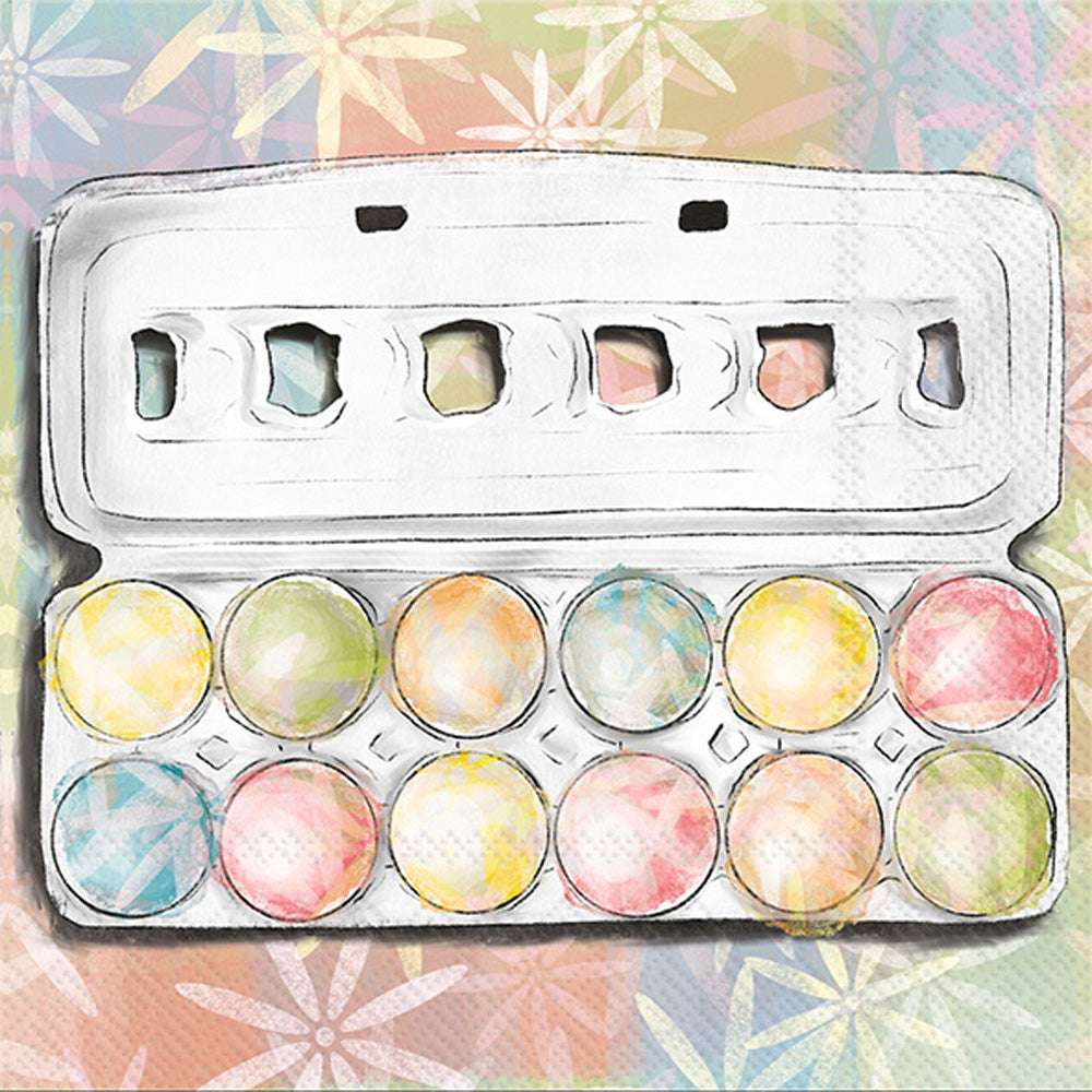 Crack open the fun with the By The Dozen Cocktail Napkin, featuring a whimsical watercolor egg carton in lively, painterly hues. Printed on absorbent paper, these cheerful cocktail napkins elevate happy hours and brunch boards with artful charm and easy cleanup. Approximate dimensions are 5 x 5 x 1 inches. German printed on soft, 3-ply paper.