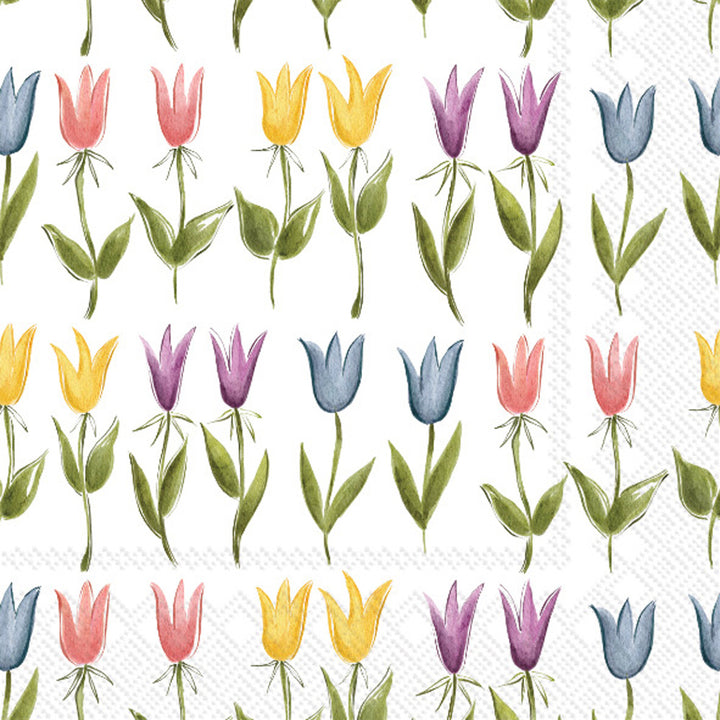 Painterly rows of tulips in pink, yellow, purple, and blue bloom across these paper cocktail napkins, bringing effortless charm to sips and small bites. Sturdy yet refined, they add a crisp floral pop to everything from casual aperitifs to celebratory toasts. Approximate dimensions are 5 x 5 x 1 inches. German printed on soft, 3-ply paper.