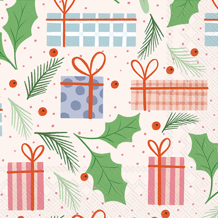 Wrapped packages and cheerful greenery dance across these paper cocktail napkins, instantly adding a celebratory spark to drinks and small bites. Soft yet sturdy, the Presents design is an easy way to gift-wrap your tabletop for toasts, showers, and everyday gatherings. Approximate dimensions are 5 x 5 x 1 inches. German printed on soft, 3-ply paper.