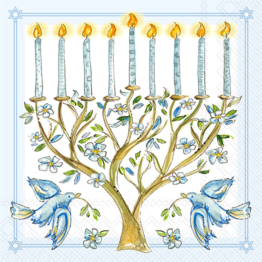 Grace your gathering with the RB Menorah Cocktail Napkin, featuring an elegant watercolor menorah with glowing candles, flowering branches, and peaceful doves in a serene blue-and-gold palette. Crafted from quality paper, these cocktail napkins lend a refined, meaningful touch to drinks and small bites. Approximate dimensions are 5 x 5 x 1 inches. German printed on soft, 3-ply paper.