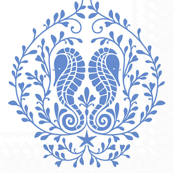 Grand Millennial Cocktail Napkins set a soft white paper stage for twin seahorses encircled by leafy scrollwork, blending heirloom charm with breezy coastal style. Ideal for cocktails and canapés, this patterned paper design brings a polished pop to bar carts, coffee tables, and everyday entertaining. Approximate dimensions are 5 x 5 x 1 inches. German printed on soft, 3-ply paper.