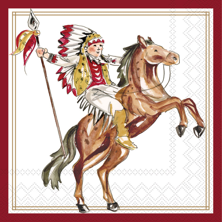 Celebrate hometown pride with the Riding Sentinel Hometown Pride Cocktail Napkin, showcasing a dynamic horse-and-rider mascot rendered in painterly detail and framed by a bold border. Crafted from soft, absorbent paper, these cocktail napkins add spirited style to watch parties, tailgates, and everyday entertaining. Approximate dimensions are 5 x 5 x 1 inches. German printed on soft, 3-ply paper.