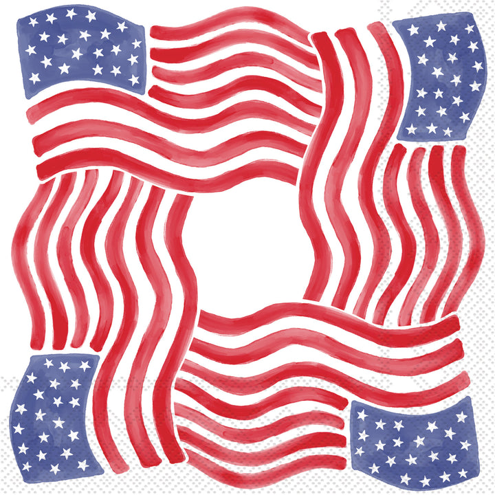 These square paper cocktail napkins showcase a painterly stars-and-stripes motif, lending a bold patriotic accent to any toast or tray. Soft, absorbent, and perfectly sized for cocktails and small bites, they keep hands tidy while adding crisp color to bar carts and tabletops. German printed on soft, 3-ply paper. Approximate dimensions are 5 x 5 x 1 inches.
