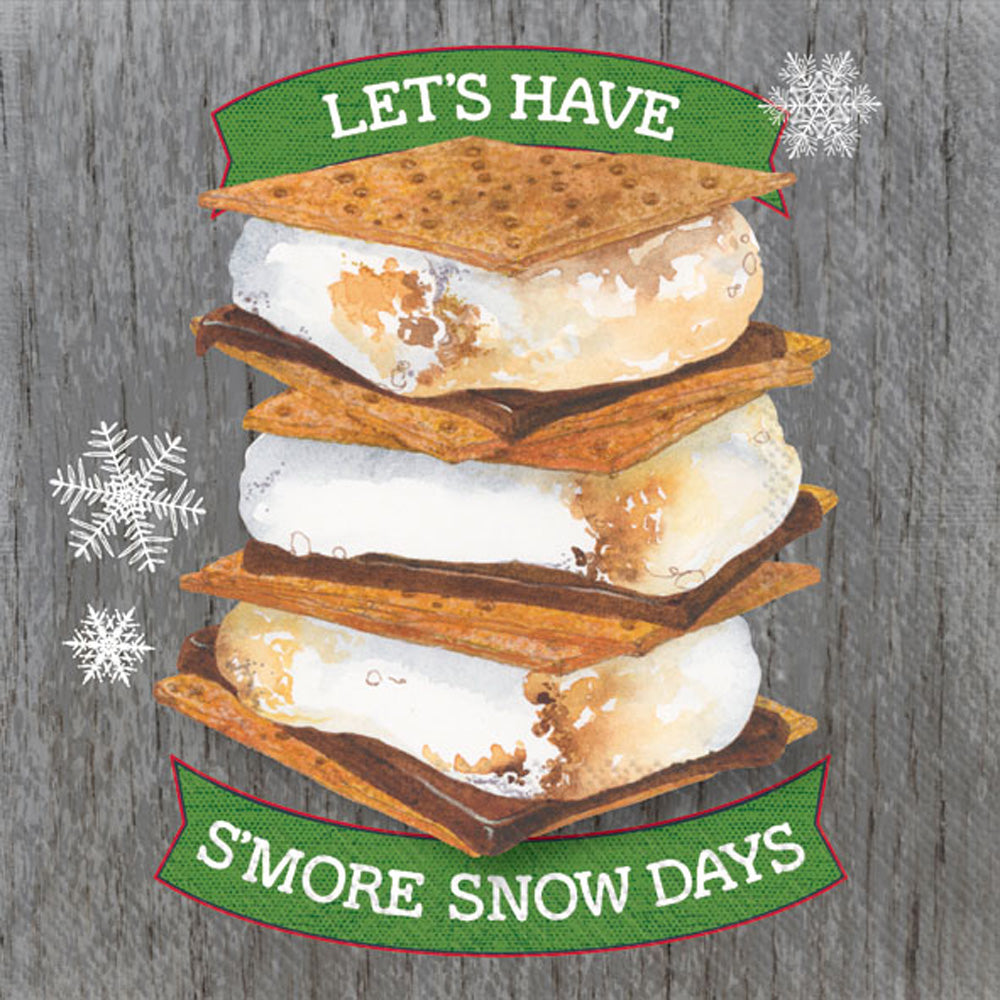Serve smiles with this printed paper cocktail napkin featuring a towering s’mores illustration, snowflake accents, and the cheerful sentiment “Let’s Have S’more Snow Days.” Perfect for cocoa bars, dessert trays, and wintry happy hours, these napkins add a playful, fireside vibe to every sip and bite. Approximate dimensions are 5 x 5 x 1 inches. German printed on soft, 3-ply paper.
