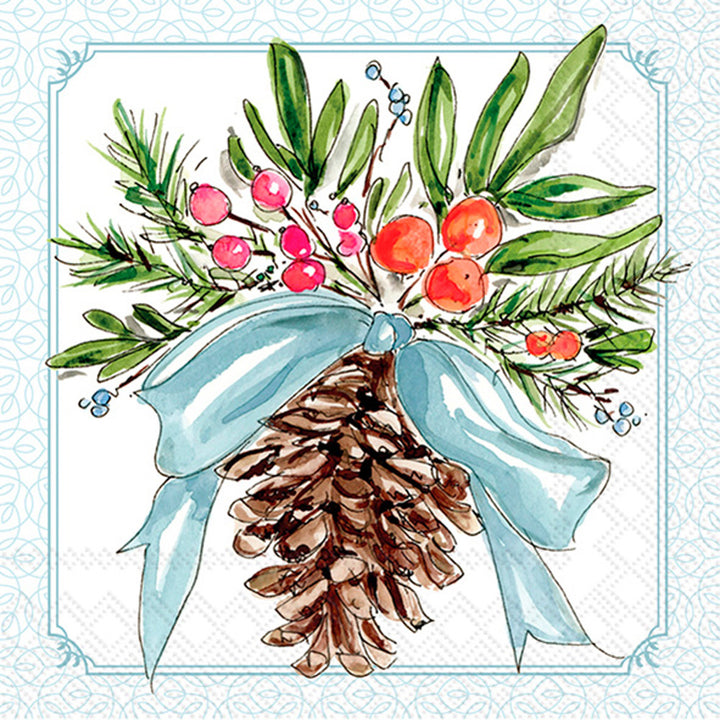 An artful pinecone bouquet tied with a pale blue ribbon gives these paper cocktail napkins a fresh, nature-inspired elegance. Printed on soft yet sturdy paper, they elevate drinks and small bites with a polished woodland accent at any gathering. Approximate dimensions are 5 x 5 x 1 inches. German printed on soft, 3-ply paper.